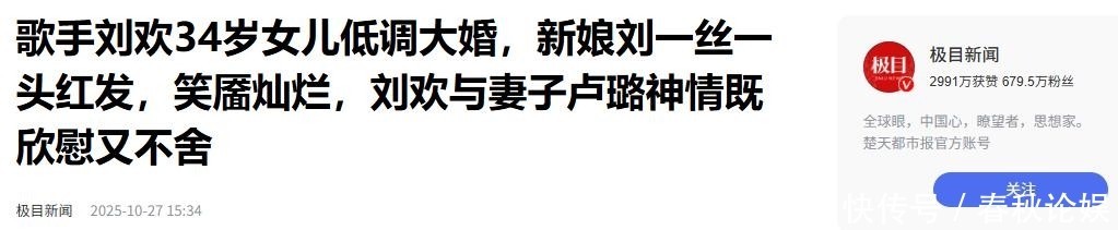 极目新闻,2025-10-27,歌手刘欢34岁女儿低调大婚,新娘刘一丝一头红发,笑靥灿烂,刘欢与妻子卢璐神情既欣慰又不舍